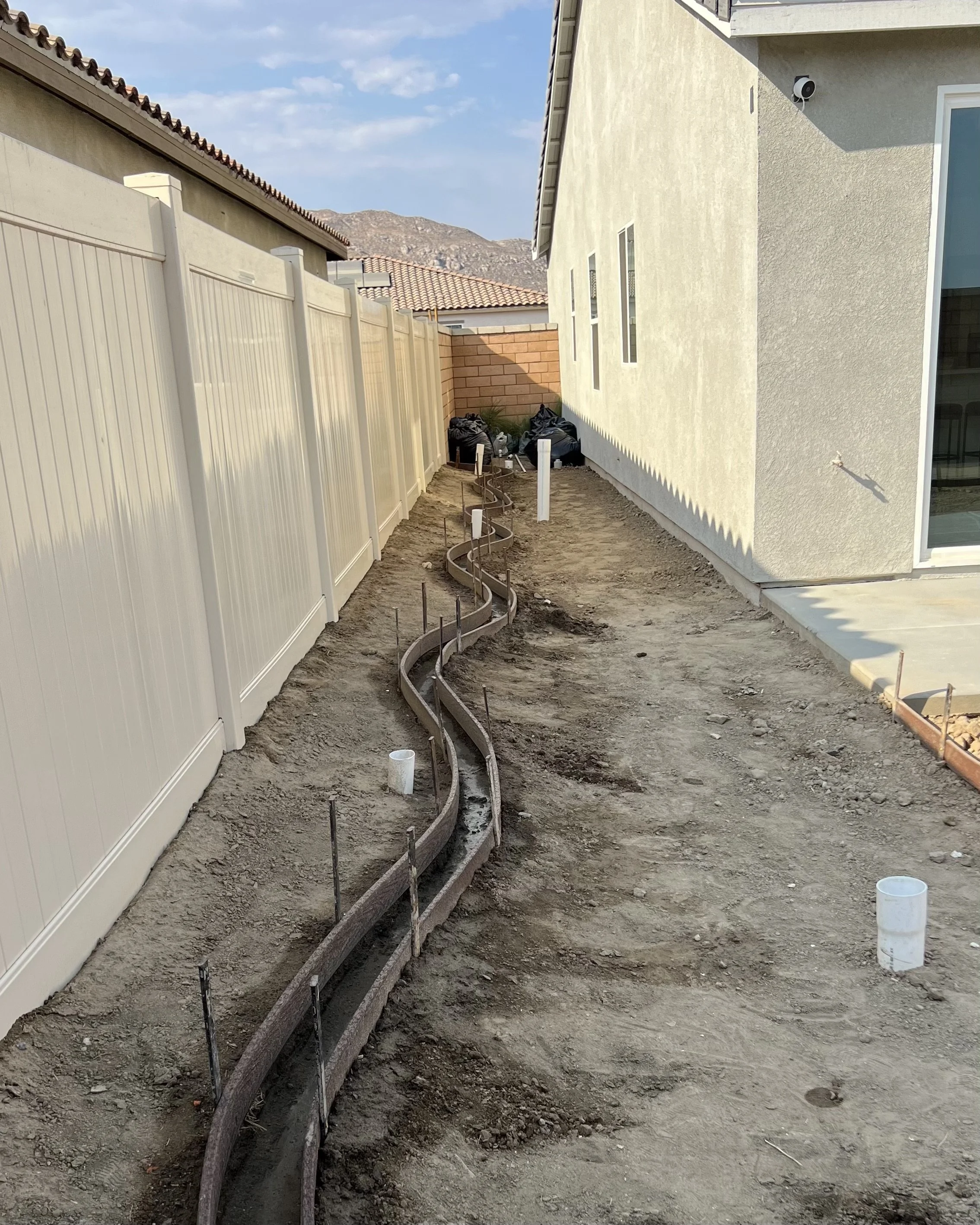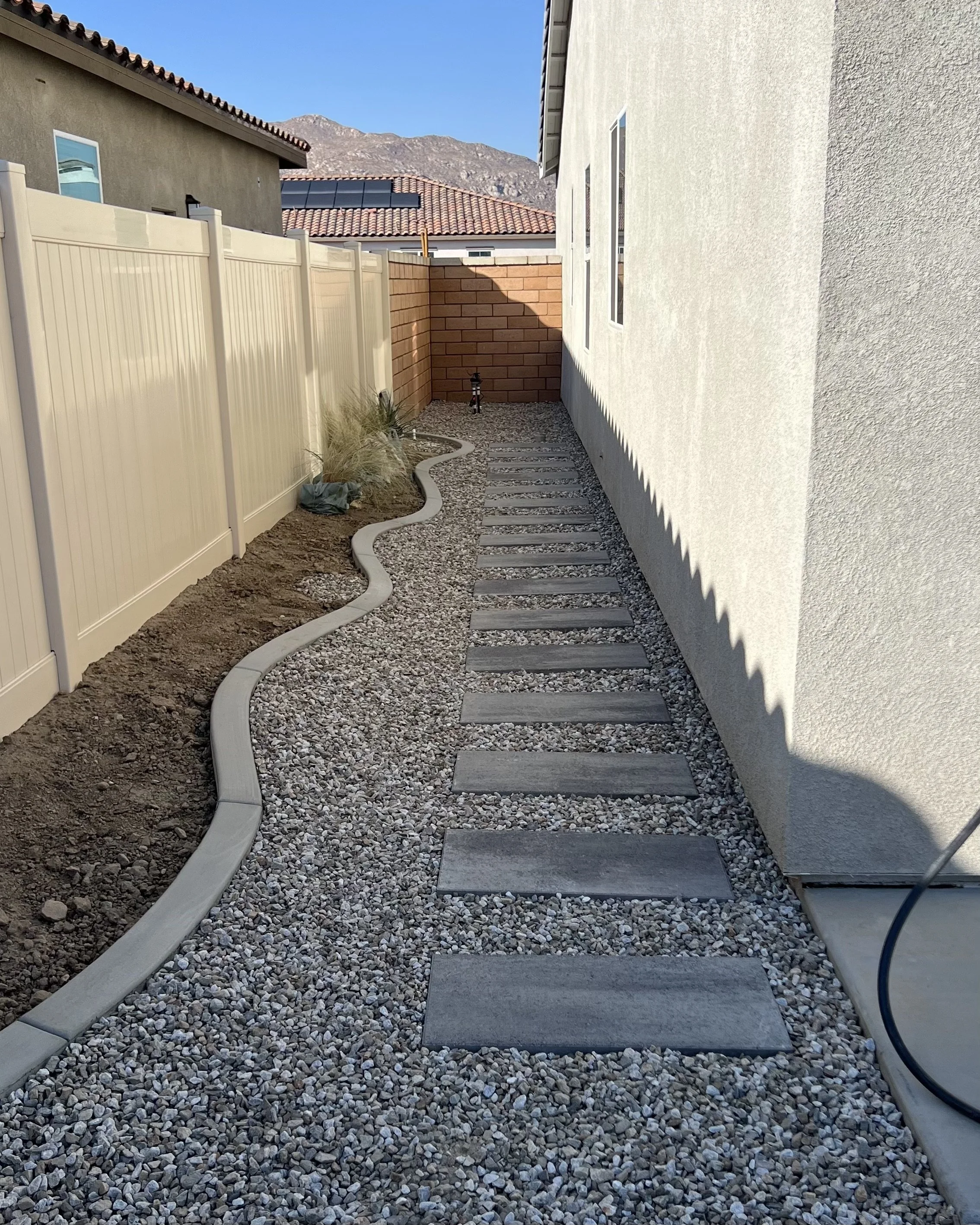 Curved side-yard walkway with poured concrete edging, stepping stones, and gravel finish. Designed to improve access while maintaining a clean, natural flow.